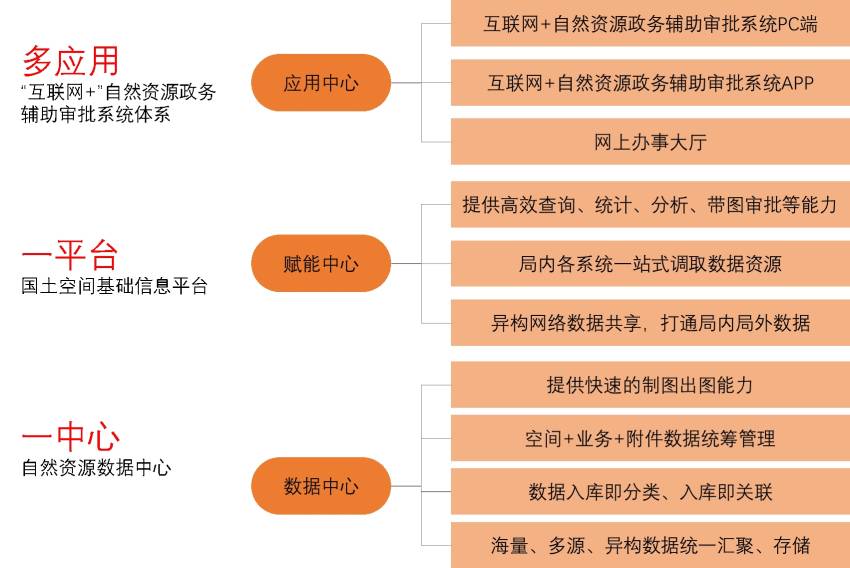 按照“一中心、一平臺(tái)、多應(yīng)用”的“1+1+N”體系構(gòu)建,打造一個(gè)數(shù)據(jù)中心、一個(gè)賦能中心和一個(gè)應(yīng)用中心,統(tǒng)籌設(shè)計(jì)形成互聯(lián)網(wǎng)+自然資源政務(wù)服務(wù)體系。