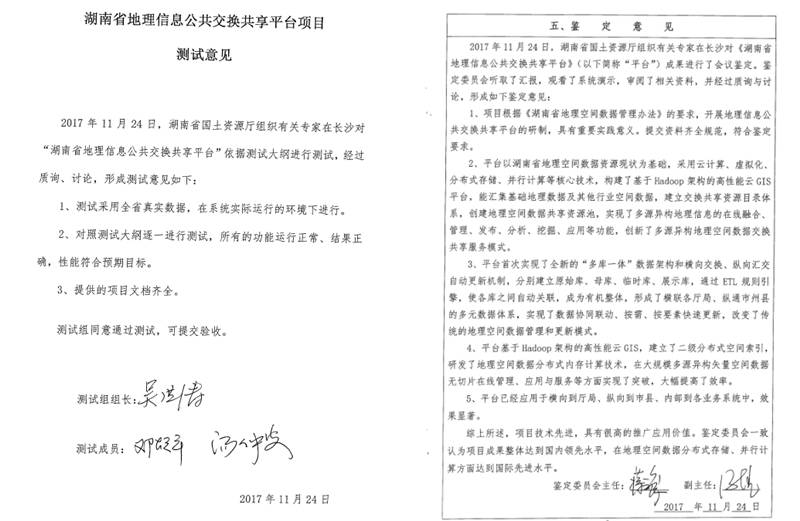 在下午的科技成果鑒定會上,以國土資源部信息中心蔣文彪主任為代表的鑒定委員會一致認為:“湖南省地理信息公共交換共享平臺”技術先進,具有很高的應用推廣價值。項目成果整體達到國內(nèi)領先水平,在地理空間數(shù)據(jù)分布式存儲、并行計算方面達到國際先進水平。