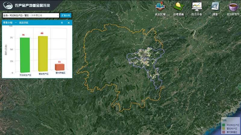 對前期背景數(shù)據(jù)、試點(diǎn)采樣情況、分區(qū)情況等試點(diǎn)區(qū)域數(shù)據(jù),系統(tǒng)支持對數(shù)據(jù)無需緩存切片即可按業(yè)務(wù)要求實(shí)現(xiàn)快速瀏覽展示。并通過對各土壤及農(nóng)產(chǎn)品采樣信息及理化性質(zhì)數(shù)據(jù)等進(jìn)行常規(guī)的數(shù)學(xué)統(tǒng)計(jì),并根據(jù)不同用戶的需求與選擇,以表格或者直方圖、餅狀圖、折線圖等多種直觀形式輸出相關(guān)結(jié)果,并在底圖上用不同顏色的樣式標(biāo)識不同污染程度區(qū)域。
