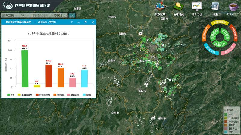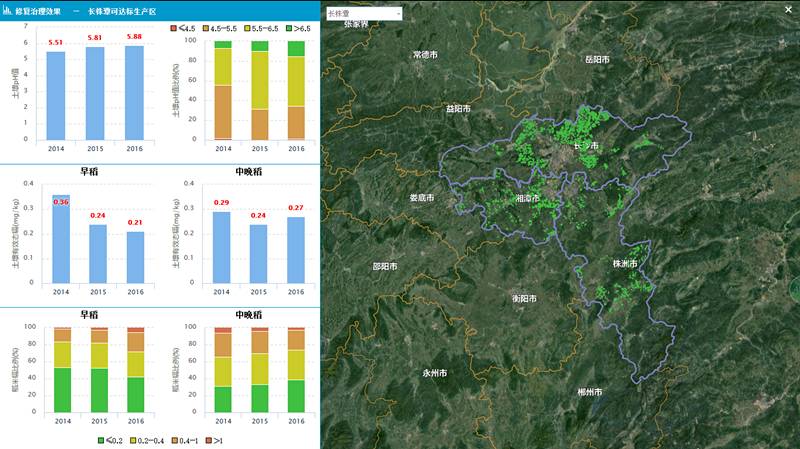 針對重金屬污染情況,湖南省采取VIP+N的技術(shù)措施進(jìn)行修復(fù)治理。不同區(qū)域的重金屬污染程度不同,分別采取不同措施以達(dá)到治理效果。系統(tǒng)可以通過選擇時間、區(qū)域、治理措施類型等查看歷年施用有該種技術(shù)措施的詳細(xì)情況,還可以進(jìn)行多項(xiàng)措施選擇對比。由于試點(diǎn)區(qū)域污染程度不同,治理修復(fù)成效也不同,系統(tǒng)支持對數(shù)據(jù)靈活渲染、動態(tài)顯示。